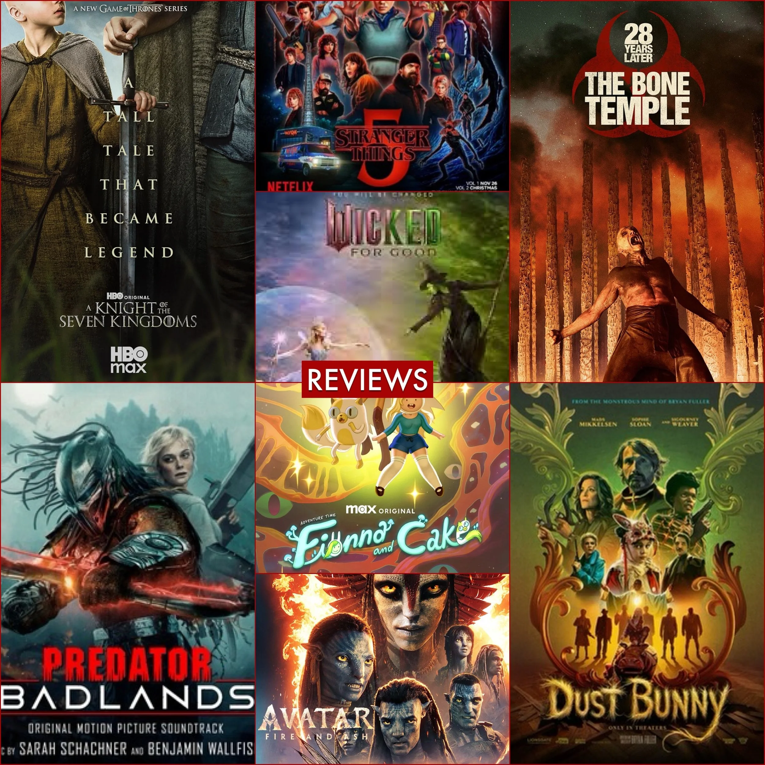 Fionna and Cake s2, A Knight of the Seven Kingdoms, Stranger Things series finale, Avatar: Fire and Ash, Dust Bunny, Predator: Badlands, 28 Years Later: The Bone Temple, Wicked: For Good