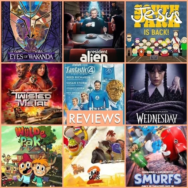 In this episode we review Eyes of Wakanda, Resident Alien series finale, South Park, Twisted Metal, Wednesday, Wylde Pak, The Bad Guys 2, The Fantastic Four: First Steps, Smurfs